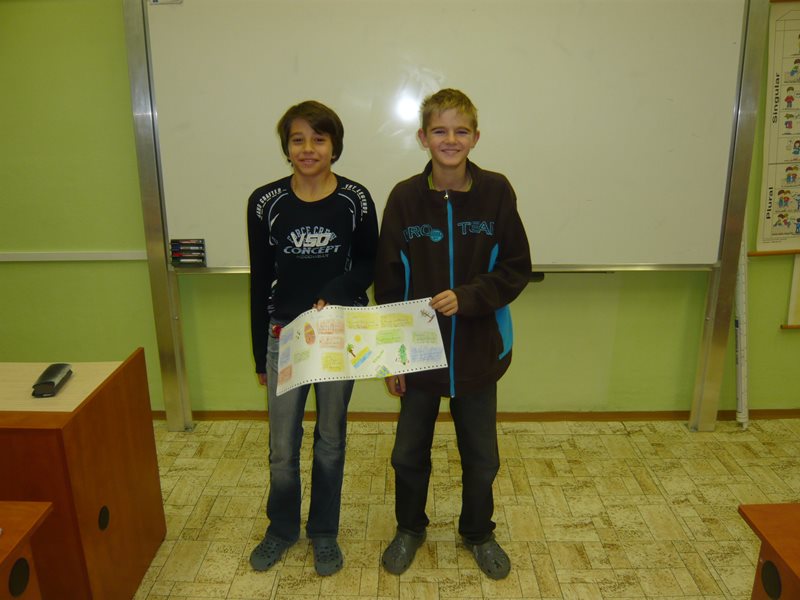 Děti pracovaly ve skupinkách a snažily se zpracovat kalendářní rok z různých úhlů pohledu. Zahrnuly obecné informace týkající se jednotlivých měsíců i podrobnosti osobní povahy jako jsou datumy narozenin. Své práce vyzdobily obrázky a na výsledné dílo je opravdu radost pohledět. Však nám také zdobí jazykovou učebnu. V neposlední řadě to pro děti byla dobrá příležitost vyzkoušet si přítomný čas prostý v reálném kontextu.