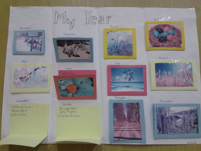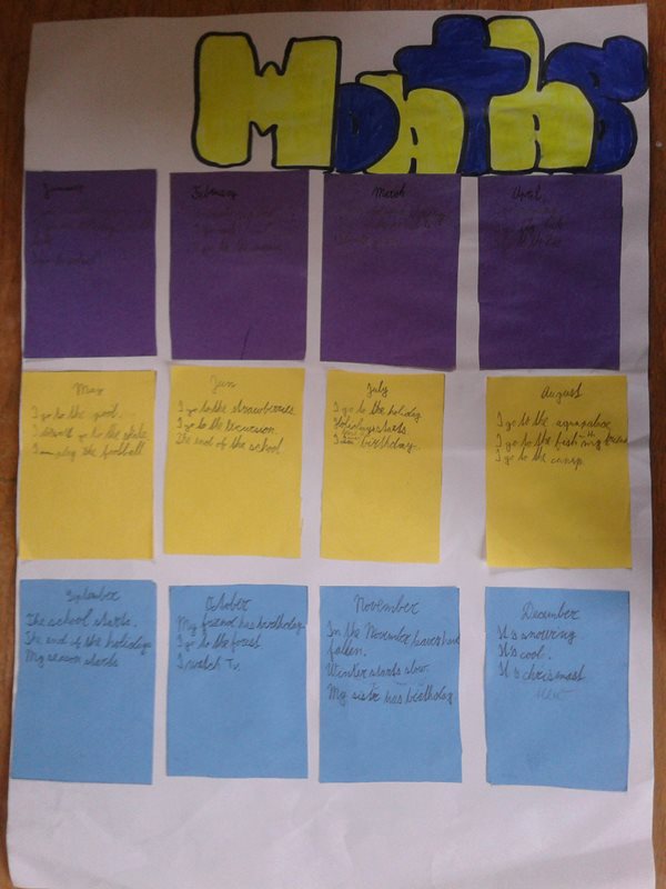 Děti si přinesly spoustu obrázků, barevných papírů a dalšího materiálu, který použily, aby vytvořily plakáty, které měly představit, jak tráví všech dvanáct měsíců. Každý zapojil fantazii a přišel s originálním nápadem na zpracování. Někomu postačily kousky barevných papírů, jiný si dal práci s hvězdičkami, kapsičkami, či kartičkami.