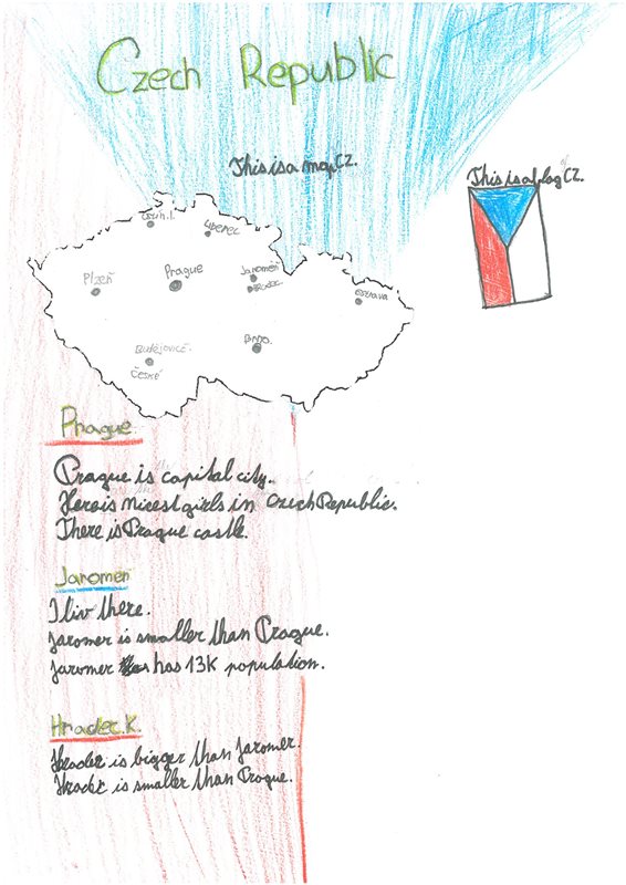 Na konci lekce nás samozřejmě čekal projekt neboli samostatná práce. Protože o Spojeném království Velké Británie a Severního Irska jsme se toho už dověděli dost, zkusili jsme zpracovat jiné státy. Většina žáků se nehnala nikam daleko a pustili se do České republiky. Na mapě vyznačili nejdůležitější body a začali srovnávat, popisovat největších krásy naší vlasti. Několik děti se pustilo do vzdálenějších krajů, jako je např. Japonsko.