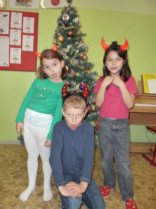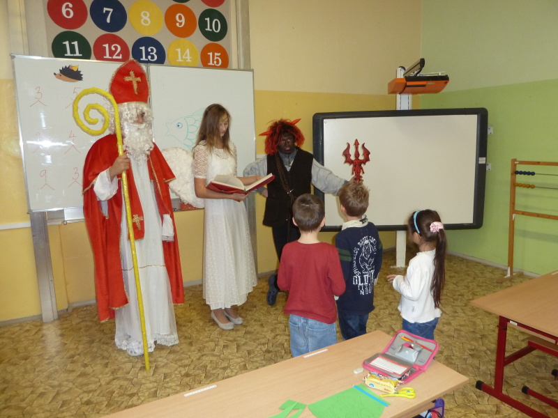 Poslední vyučovací hodinu nás poctil svou návštěvou svatý Mikuláš s čertem a dvěma anděly. Měli s sebou Knihu hříchů a vše o nás věděli. Dostali jsme pochvalu za pěkné čtení a dokonce se přiznali i hříšníci naší třídy.