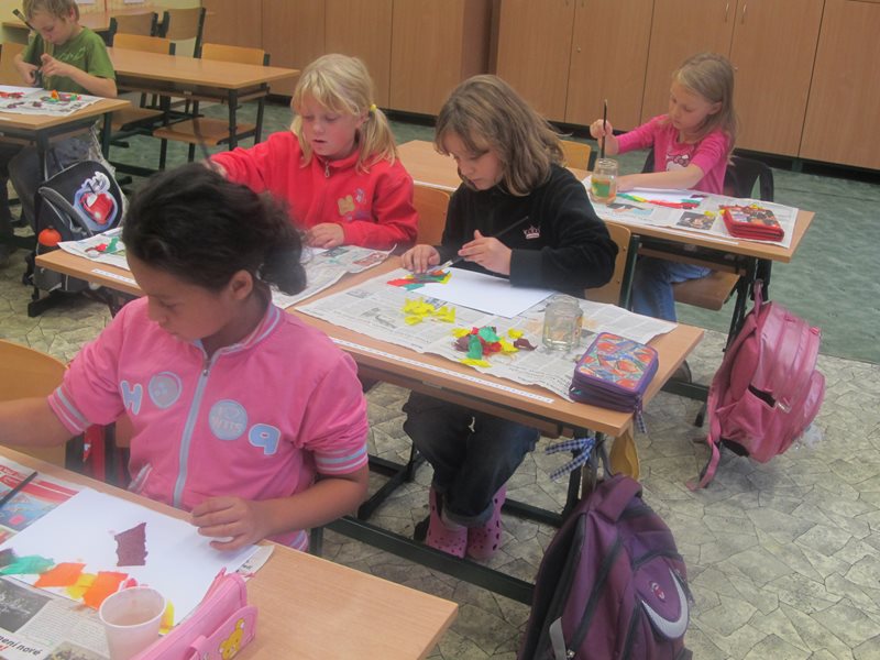 Pustili jsme se do zapouštění barev a vyrobili si podzimní stromořadí, vyttvořili netradičním způsobem pozadí plné barev podzimního listí a zkusili nakreslit košatý strom, což pro mnohé není jednoduché. "Sklidili" jsme dýni a řepu,"ochutnali" jablíčka, vymodelovali ovoce a zeleninu a nakreslili si svého skřítka podzimníčka.