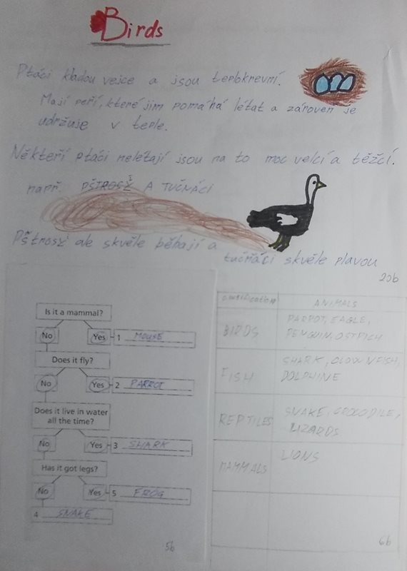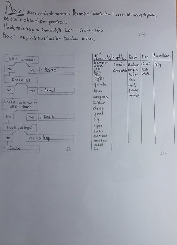 V podstatě velice podobné. Také dělí zvířata podle druhu, jenom ty názvy naše známá slovíčka příliš nepřipomínají. Ale ve chvíli, kdy děti rozluštily, kdo to jsou ti „amphibians, reptiles a mamals“, zjistily, že to jsou věci, které už znají, a daly se do hledání dalších informací.
