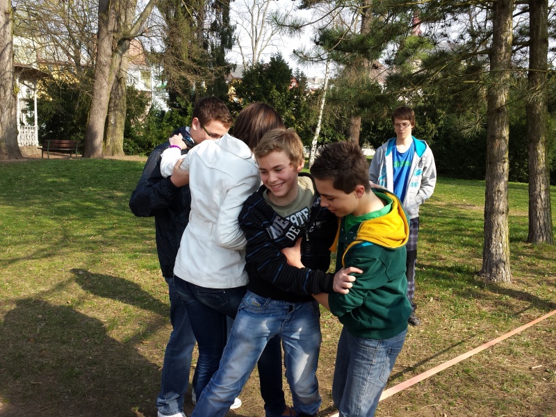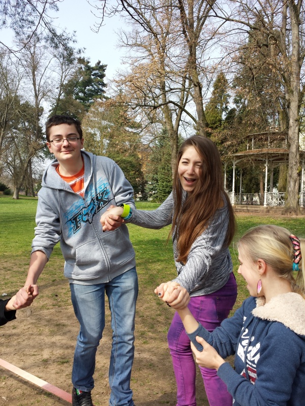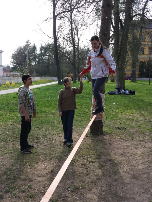 Na nových slacklinách jsme tedy vyzkoušeli komunikaci při řešení problému, neboť chůze ve výšce na labilní lávce opravdu vyžaduje značnou dávku úsilí a soustředěnosti. A protože jsme byli poprvé, chodili naši žáci s vodiči, kterým svěřili absolutní důvěru. Zúčastněné žáky slackline naprosto nadchla! Z počátečního ostychu sešlo velmi brzy, a tak jsme mohli na „lajnu“ poslat i dva lidi proti sobě, kteří měli za úkol vzájemně se domluvit a dojít na druhý konec, aniž by se dotkli země. Z přiložené fotogalerie posuďte sami, jak jim to šlo.