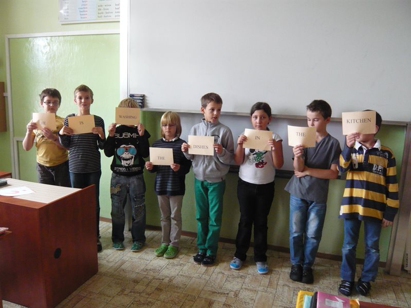 Jistě lze souhlasit s tvrzením, že člověk se lépe učí to, co si vyzkouší na vlastní kůži, co si prožije. My jsme se tohoto názoru drželi při hodině angličtiny ve čtvrté třídě. Sestavování vět v přítomném čase průběhovém jsme si opravdu prožili. A dovolím si tvrdit, že i užili:-)