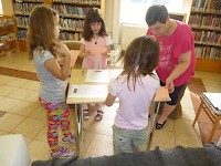 V knihovně je přivítaly paní knihovnice a rozdělily je do pěti skupin. Každá skupina prošla pěti stanovišti, kde děti musely prokázat čtenářskou dovednost. Nakonec se to všem povedlo, a tak je mohl císař Josef II. pasovat na opravdové čtenáře s právem využívat služeb knihovny.