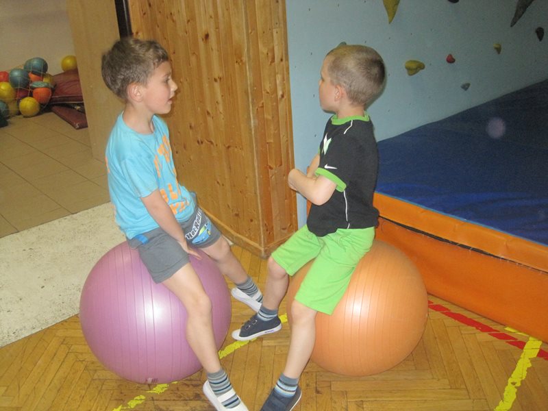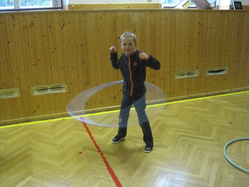 Děti měly během malých přestávek v tělocvičně k dispozici molitanové talíře, obruče, gymnastické míče a plastové chůdy.