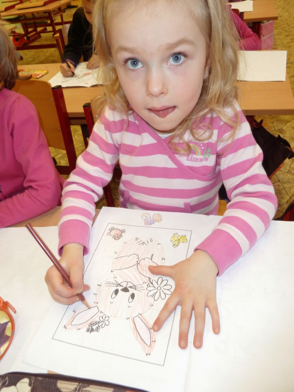 Pro lepší práci jsme si děti hned na začátku rozdělili do dvou tříd. Tentokrát jsme se zaměřili na svátky jara, tedy Velikonoce. Naučili jsme se spolu velikonoční koledu, řekli si o tradicích a naučili se vyjmenovat zvířecí rodinky a dokonce jsme stihli i počítat a vybarvovat velikonoční obrázky. Na závěr jsme si u klavíru zazpívali jarní písničku Žabička zelená.