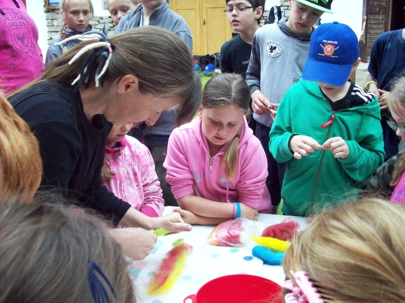 Ukázali jsme si technologii zpracování vlny - stříhání, čištění, vyčesávání, spřádání a plsnění. Na závěr byla praktická dílna plsnění. Každý si vše vyzkoušel a z barevných plsní si zhotovil obrázek.