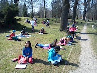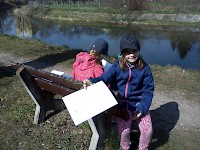 Skupinka „malířů“ z 2. B posedávala na trávníku a na lavičkách a kreslila nový most s přilehlým okolím.