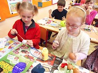 Počasí se zrovna nevydařilo, ale velikonoční přípravy ano. V hodinách výtvarné výchovy a pracovních činností jsme zdobili vejdunky, netradiční technikou kreslili velikonoční vajíčka a nakonec jsme si vyrobili kuřátka z papírových roliček. Dětem se práce líbila a velmi se jim povedla.