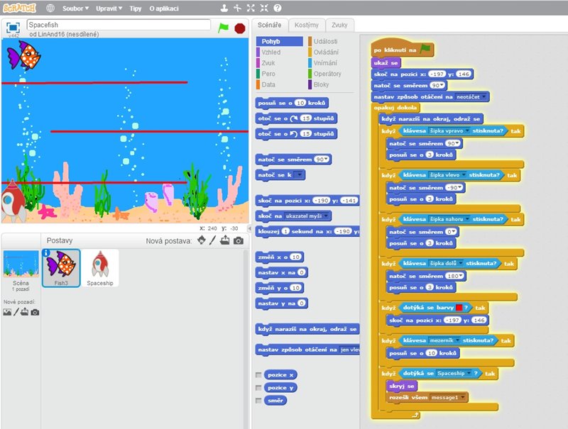 Naše programátorské pokusy jsme zakončili v programu Scratch, kde jsme využili znalost stavebních bloků z předchozích her, a každý z žáků si sám naprogramoval jednoduchou hru, kdy jedna postava musí projít bludištěm a dotknout se druhé, která zmizí.