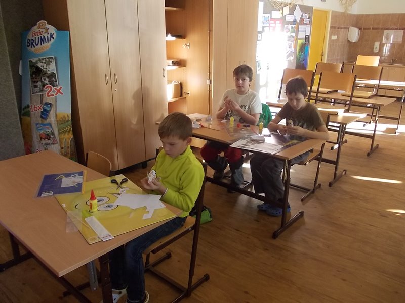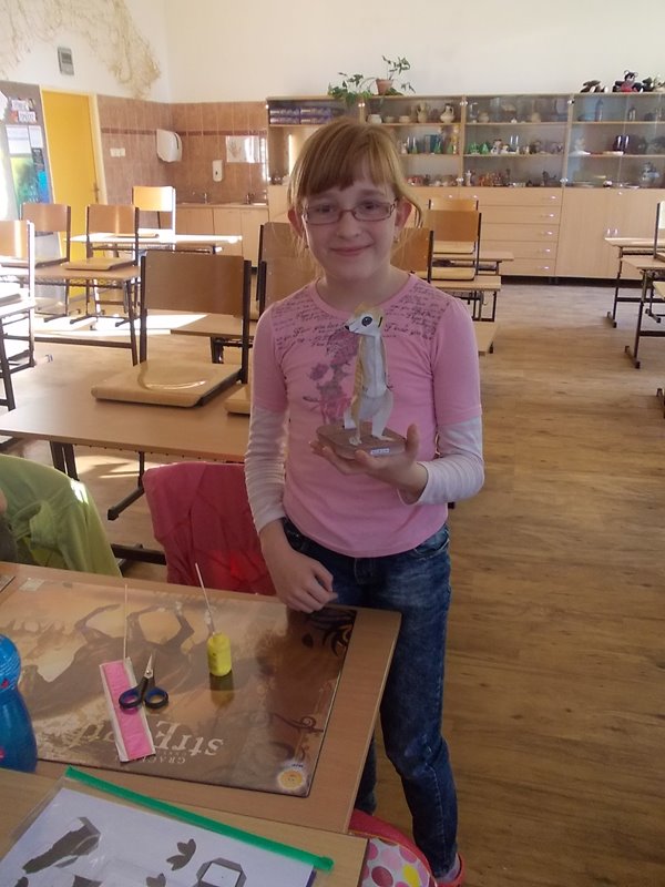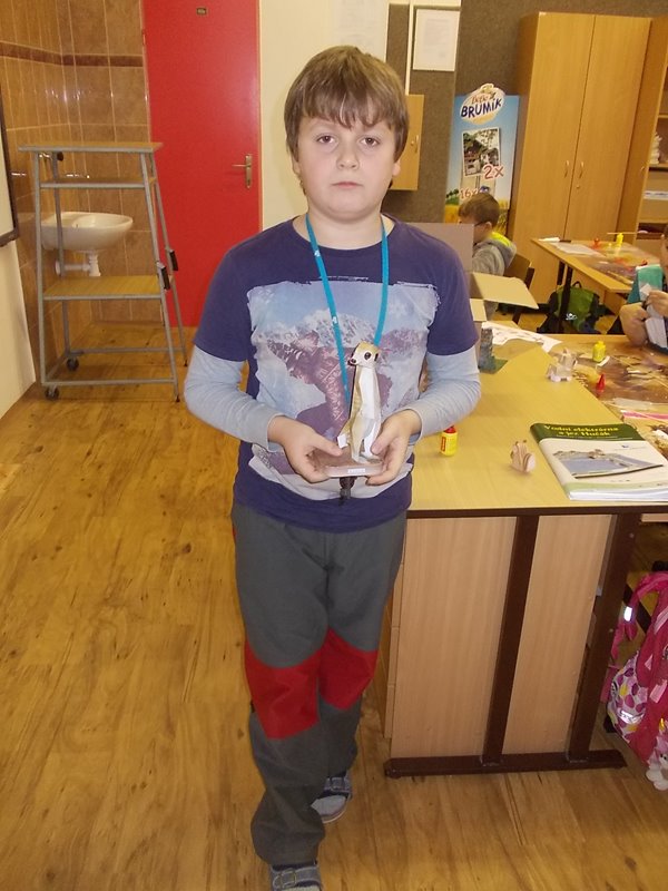 Na kroužku papírové modely už dva měsíce pilně stříháme, skládáme a lepíme surikatu. Postupně jsme dali dohromady tělo, hlavu a největší problém byl přilepit správně tlapky a přitom je nepomíchat.