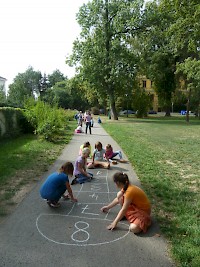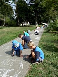 Kreslíme ve skupinkách, ve dvojicích nebo samostatně, jak kdo chce. Sluníčko nám hřeje záda a kolemjdoucí pohledem i slovně hodnotí naše výtvory. Nakonec si i my společně kresby prohlédneme a ohodnotíme. Naplníme tak zároveň i výstup z našeho ŠVP „Vyjadřuje se k tvorbě své i druhých, toleruje jejich způsob výtvarného vyjádření.“