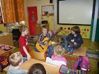 Kluci nám ukázali kytaru, popsali její části a dokonce krásně zahráli ostatním dětem. Všichni jsme si společně zazpívali několik jednoduchých písniček, které se hoši naučili v ZUŠ.