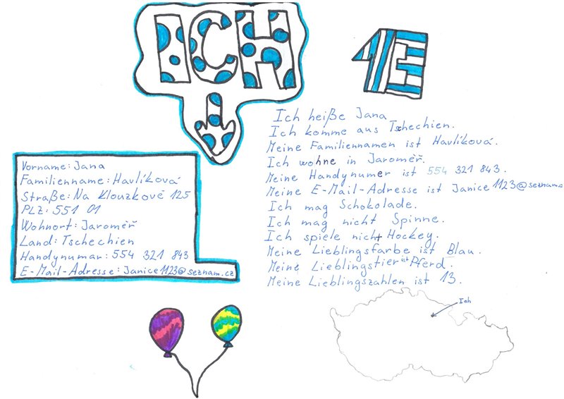 Na závěr lekce jsme se pokusili vytvořit projekt „ICH“, kde žáci měli za úkol napsat co nejvíc věcí o sobě, které už v němčině umí říct. A že toho umí docela dost, se můžete přesvědčit ve fotogalerii.