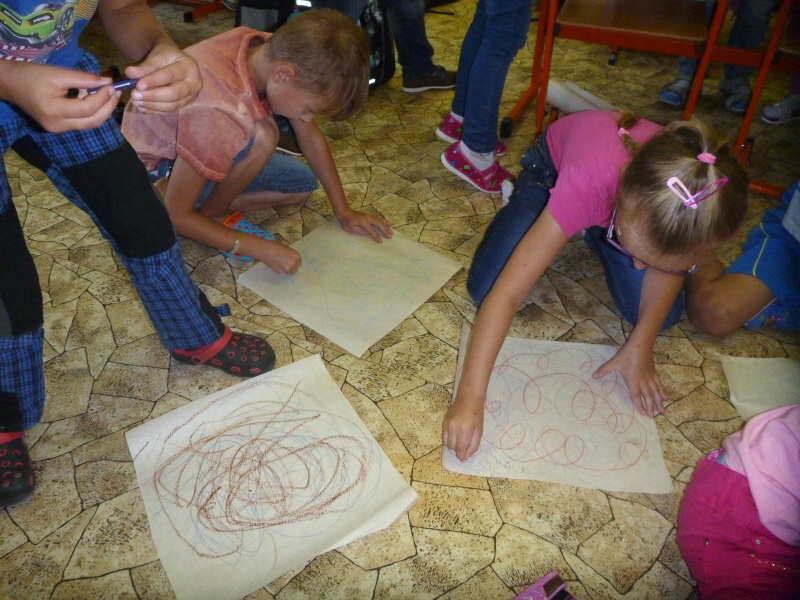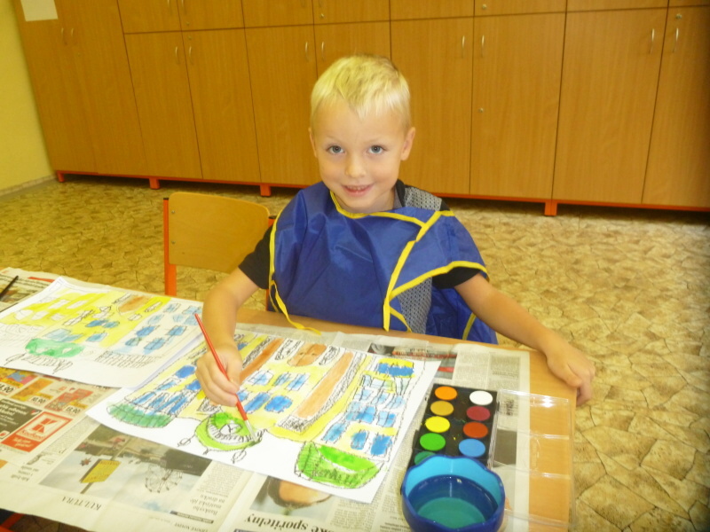 Milí rodiče, podívejte se, jak nám to ve škole jde. Učíme se psát, kreslit naši školu a malovat vodovými barvami. Všichni musíme umět geometrické tvary – čtverec, obdélník, kruh, trojúhelník. A to jsme zkoušeli i po slepu. Poznáváme číslice do pěti a učíme se, co je před číslem a za číslem. Dokonce jsme už krokovali, a tím jsme se učili přičítat a odčítat, zatím jenom do pěti. Podívejte se na pár foteček.