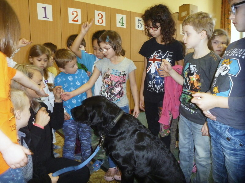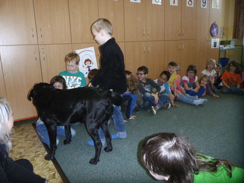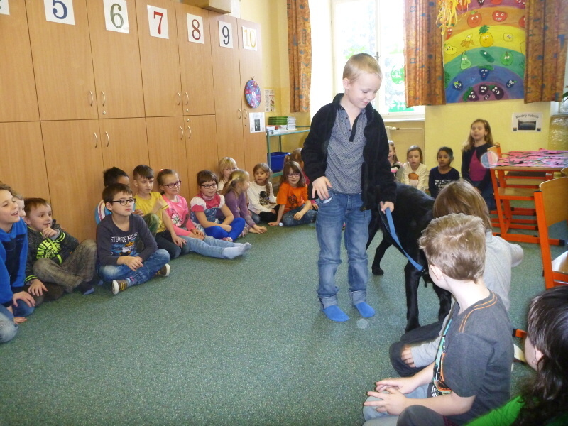 V další hodině k nám na návštěvu přišel velice hodný pejsek – přítel člověka, člen rodiny našeho spolužáka Jáchyma. Děti se dozvěděly informace, co takový pejsek potřebuje, jak se k němu mají chovat, čím se živí, k jakému chodí lékaři. Všichni si ho pohladili a někteří si mohli zkusit, jak pes reaguje na povely sedni – lehni a poté ho odměnit pamlskem.
