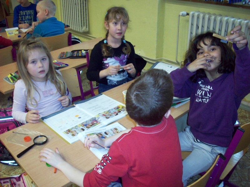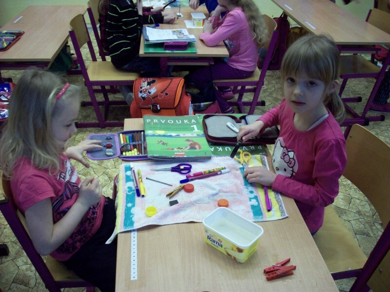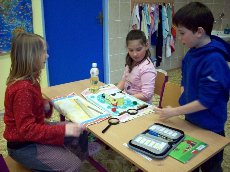 V hodině prvouky jsme se rozdělili do skupin. Každá skupinka dostala lupu, různé předměty z kovu, z plastu, ze dřeva, kelímek s vodou a magnet.