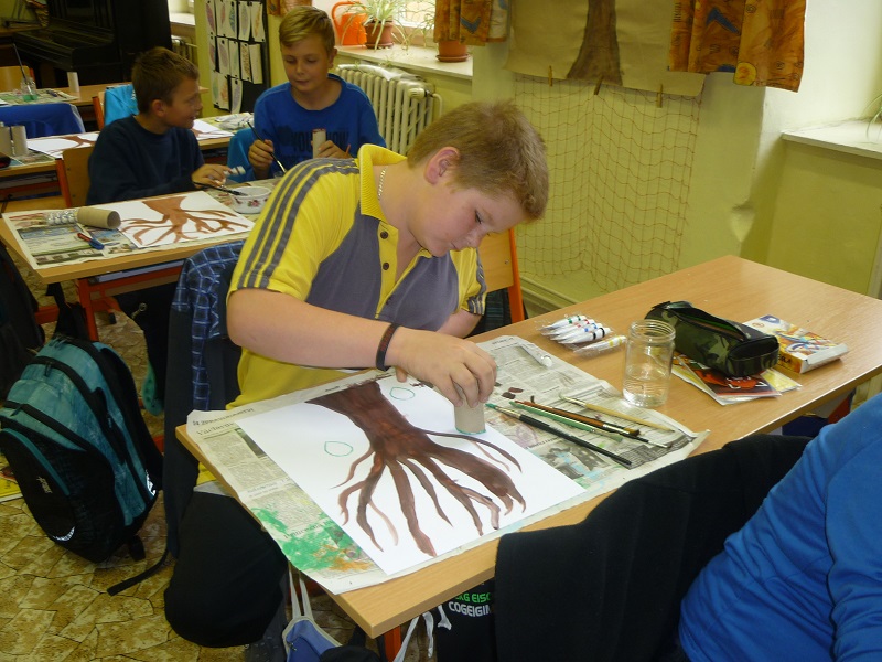 Barevný podzim jsme využili v hodinách výtvarné výchovy. Zopakovali jsme si, jak namalovat strom. Jeho korunu jsme dotvořili tiskem, podzimní barvy jsme využili jako podklad pavučin. Netradičním způsobem jsme vyzdobili listy i jablka. Na závěr, abychom si připomněli také druhou stránku podzimu, jsme si namalovali déšť a vytvořili i barevné deštníky z papíru.