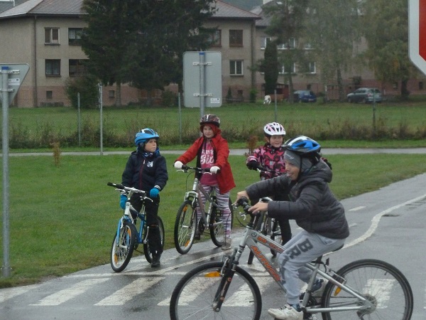 Ve středu 11.10. 2017 jsme se sešli před školou vybaveni přilbami na kolo a netrpělivě vyhlíželi autobus, který nás odvezl na dopravní hřiště v Náchodě. Nejprve si děti dopravní hřiště prošly pěšky, aby se seznámily se značkami a křižovatkami, které na ně čekají. Pak se v učebně seznámily s pravidly silničního provozu a po svačině si každý vyzvedl kolo a rozjel se zkoušet jízdu na dopravním hřišti podle předpisů. A nebylo to jen projíždění s kamarády. Děti se musely soustředit, aby nepřehlédly například značku Stůj, dej přednost v jízdě, zastavily na červenou na semaforu, správně objely překážku a zvládly jízdu na kruhovém objezdu. I když nám počasí moc nepřálo, děti se snažily a jarní zkoušku cyklisty zvládnou na výbornou.