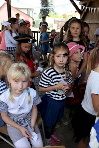Děti přišly do školy v námořnickém oblečení a už i výuka probíhala v námořnickém stylu. Cestou do jídelny to byla pěkná podívaná. Po obědě jsme se všichni osvěžili námořnickým kornoutem a na zahradě ŠD se zahradní altán proměnil v kajutu.