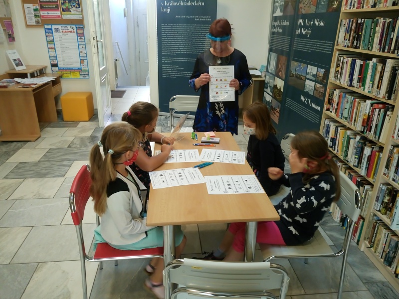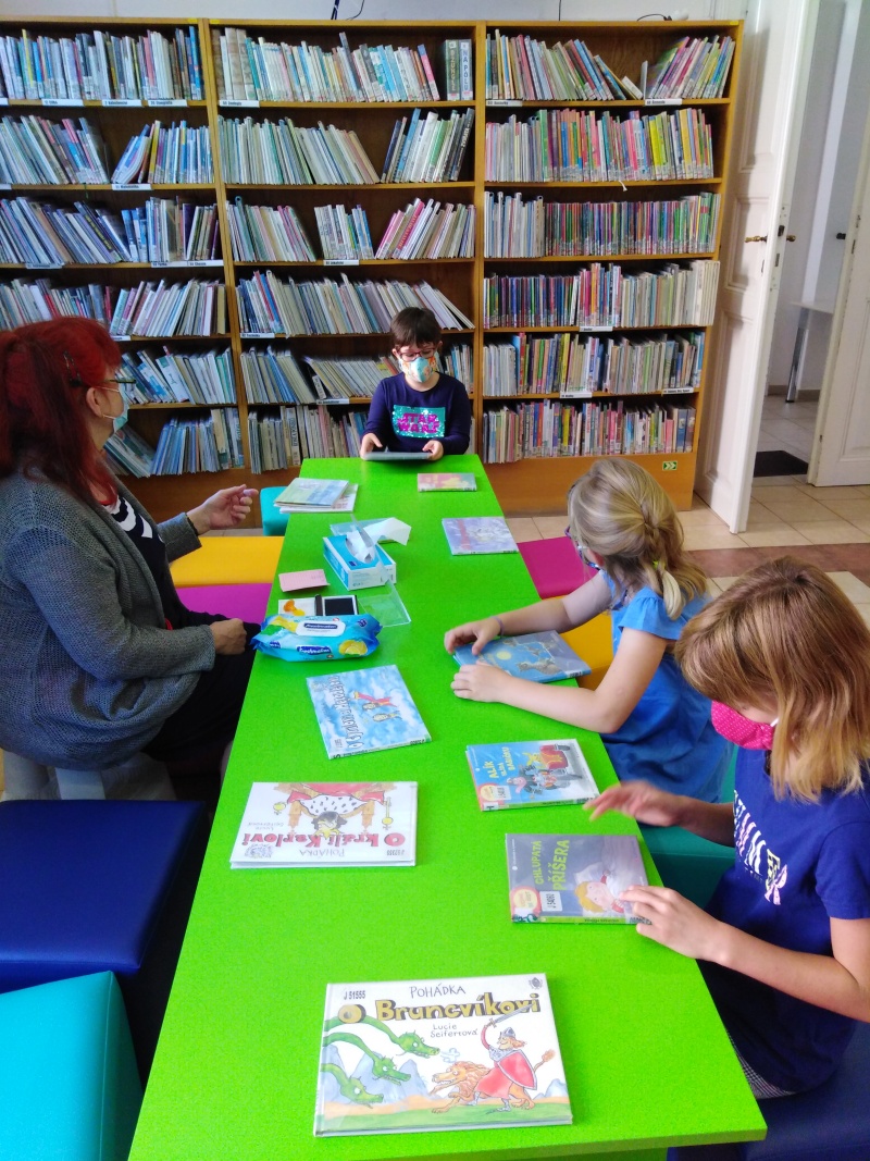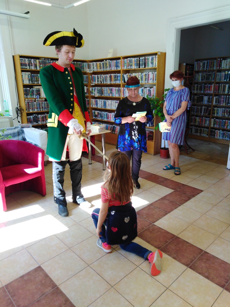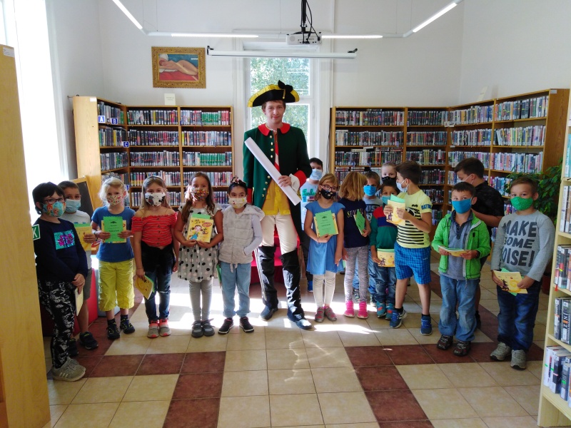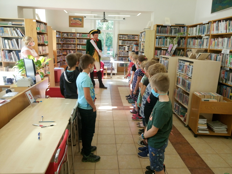 Paní knihovnice nás přivítaly a rozdělily do pěti skupin. Každá skupina dostala za úkol projít pěti stanovišti, kde jsme všichni museli prokázat určité čtenářské dovednosti. Nakonec se nám to povedlo a tak nás mohl sám císař Josef II. pasovat na opravdové čtenáře. Dostali jsme od něj pasovací glejt, pěknou knížku a právo využívat služeb knihovny. Tak hurá do knížek za zajímavostmi a dobrodružstvím!