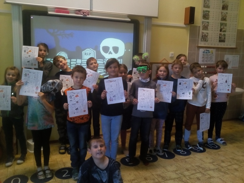 Jelikož Halloween je v anglicky mluvících zemích u dětí velmi oblíbený svátek, nemohli jsme ho ani mi při hodině anglického jazyka opomenout. Děti se dozvěděly, z jaké oblasti pochází, kde se slaví dnes, co vše děti při tomto svátku dělají. My jsme se naučili hodně příšer říci i anglicky (skeleton, zombie, ghost, mummy…) a zazpívali jsme si anglicky strašidelnou písničku. Některé děti si donesly i strašidelné masky, abychom se více báli.