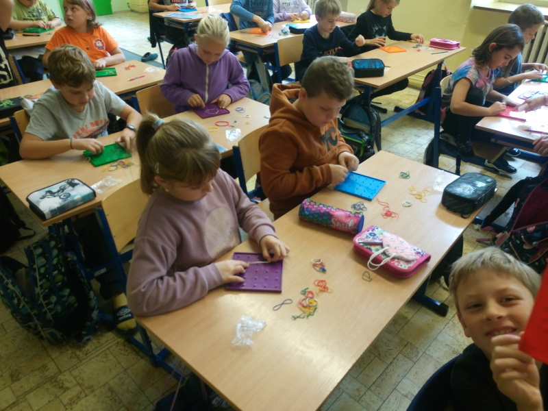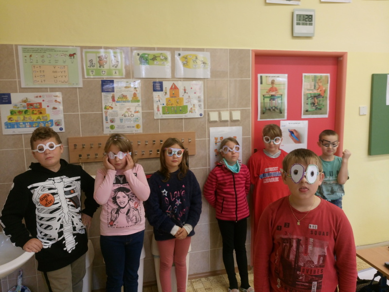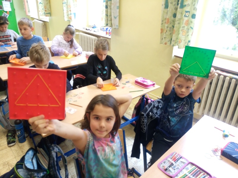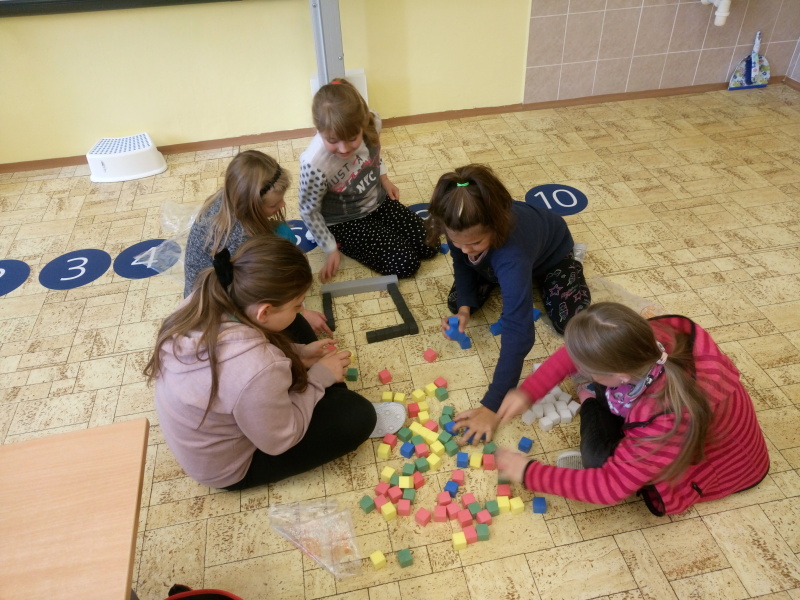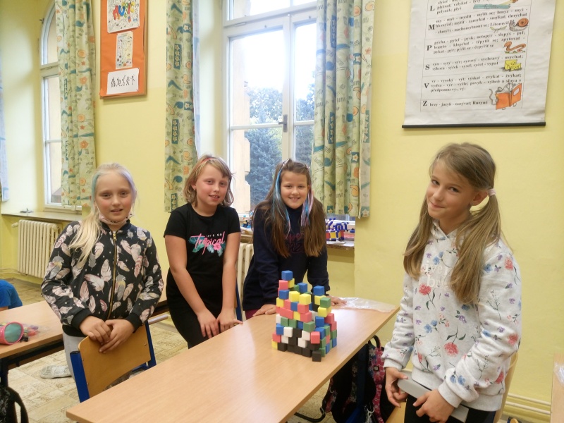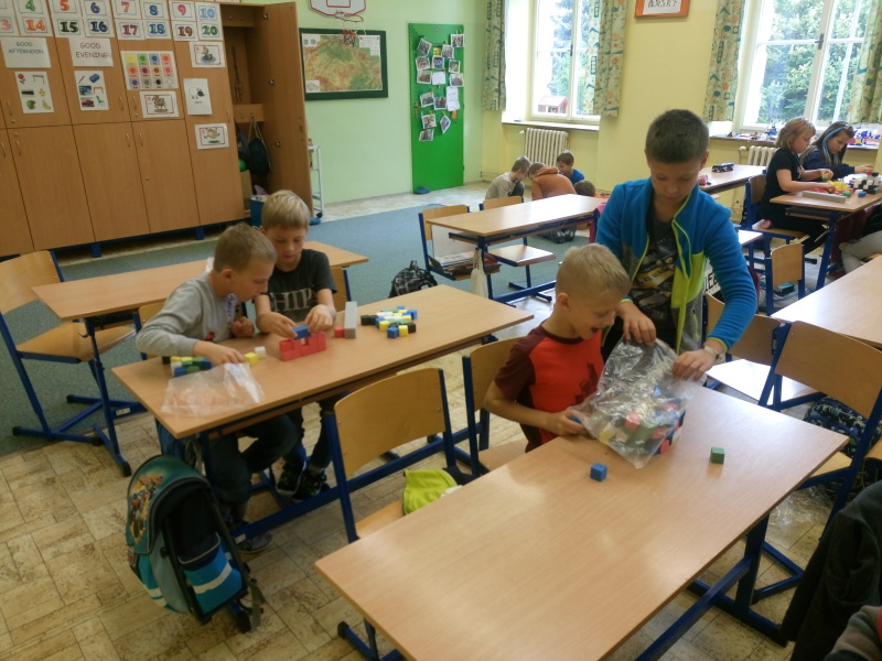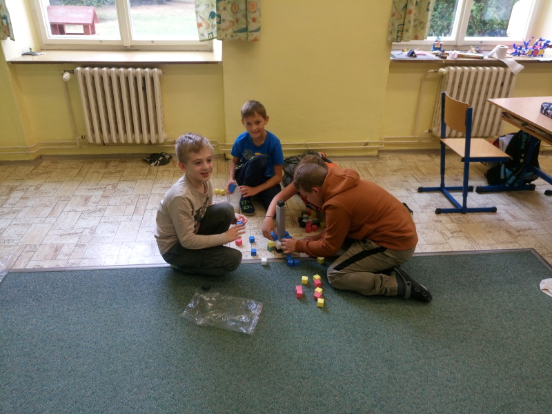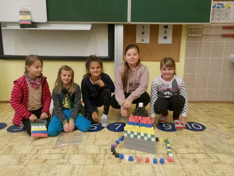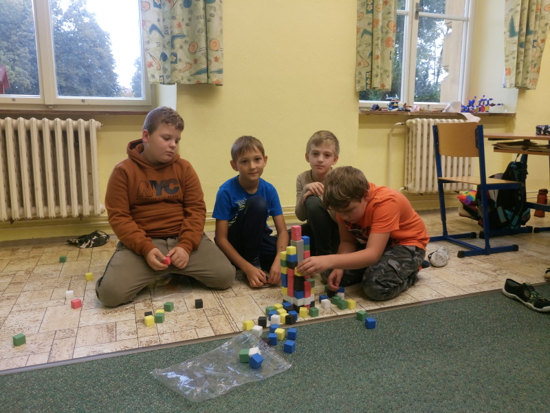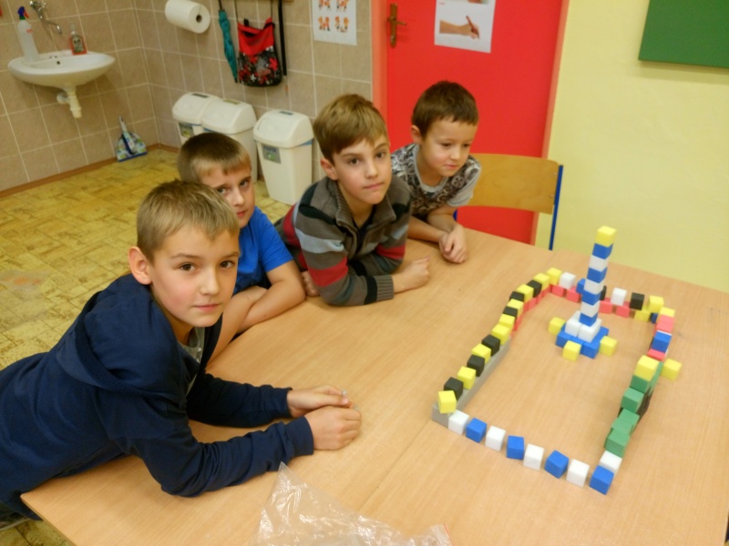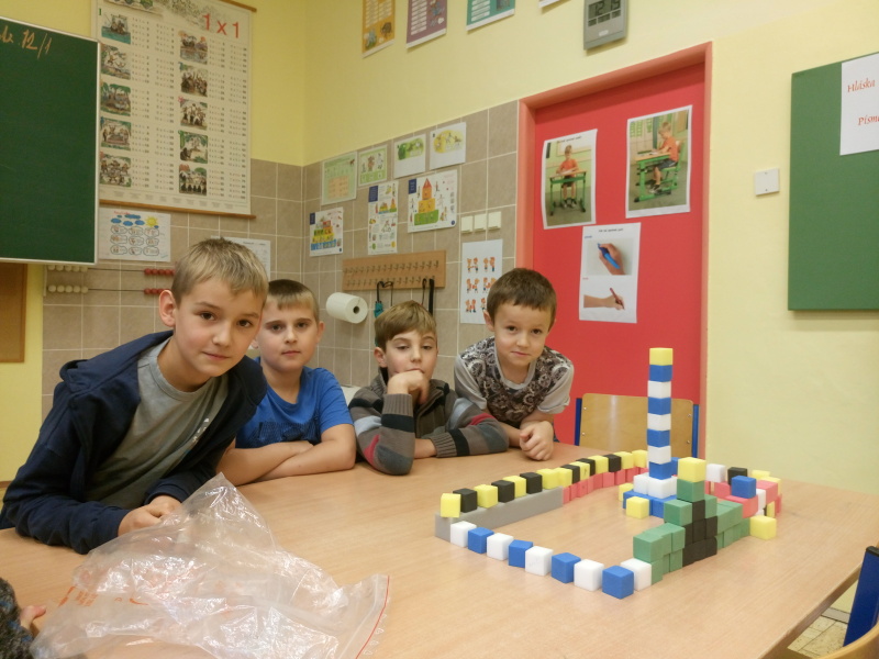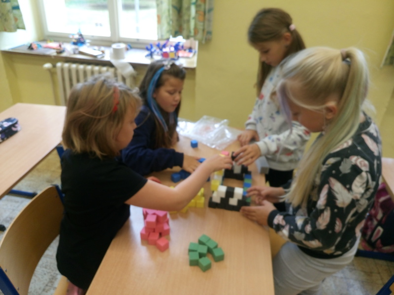Bohužel není ani moc času na fotografování. Tak alespoň pár obrázků z některých hodin pracovních činností, kdy jsme budovali stavby z krychlí a vyráběli brýle. Při matematice jsme řadili čísla podle velikosti do 1000 a pracovali s geodeskami.