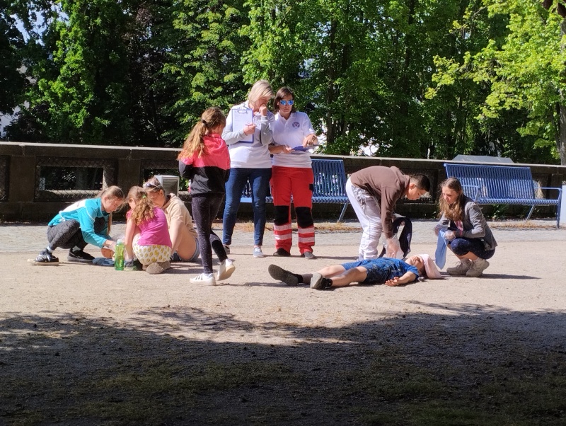 Po vítězství v okresním kole ČČK Soutěže mladých zdravotníků jsme postoupili do kola krajského, které se konalo za ideálního počasí v krásných prostorách jičínského zámku a zámeckého parku. Děti čekalo 8 stanovišť, kde měly předvést své ošetřovatelské vědomosti a dovednosti. Doprovodný program jsme si také velmi užili: navštívili jsme místní Valdickou bránu s věží, ze které jsme mohli obdivovat město Jičín a okolí, prohlédli si interaktivní expozici na motivy pohádky O loupežníku Rumcajsovi, zhlédli práci psovodů Policie ČR, fotili se s Rumcajsem a dali si na nádvoří zámku pizzu, kterou v peci upekl pravý Ital a která chutnala opravdu fantasticky. Za první stupeň jsme si odvezli 4. místo, za druhý 5. místo, drobné ceny a hodně nezapomenutelných zážitků.